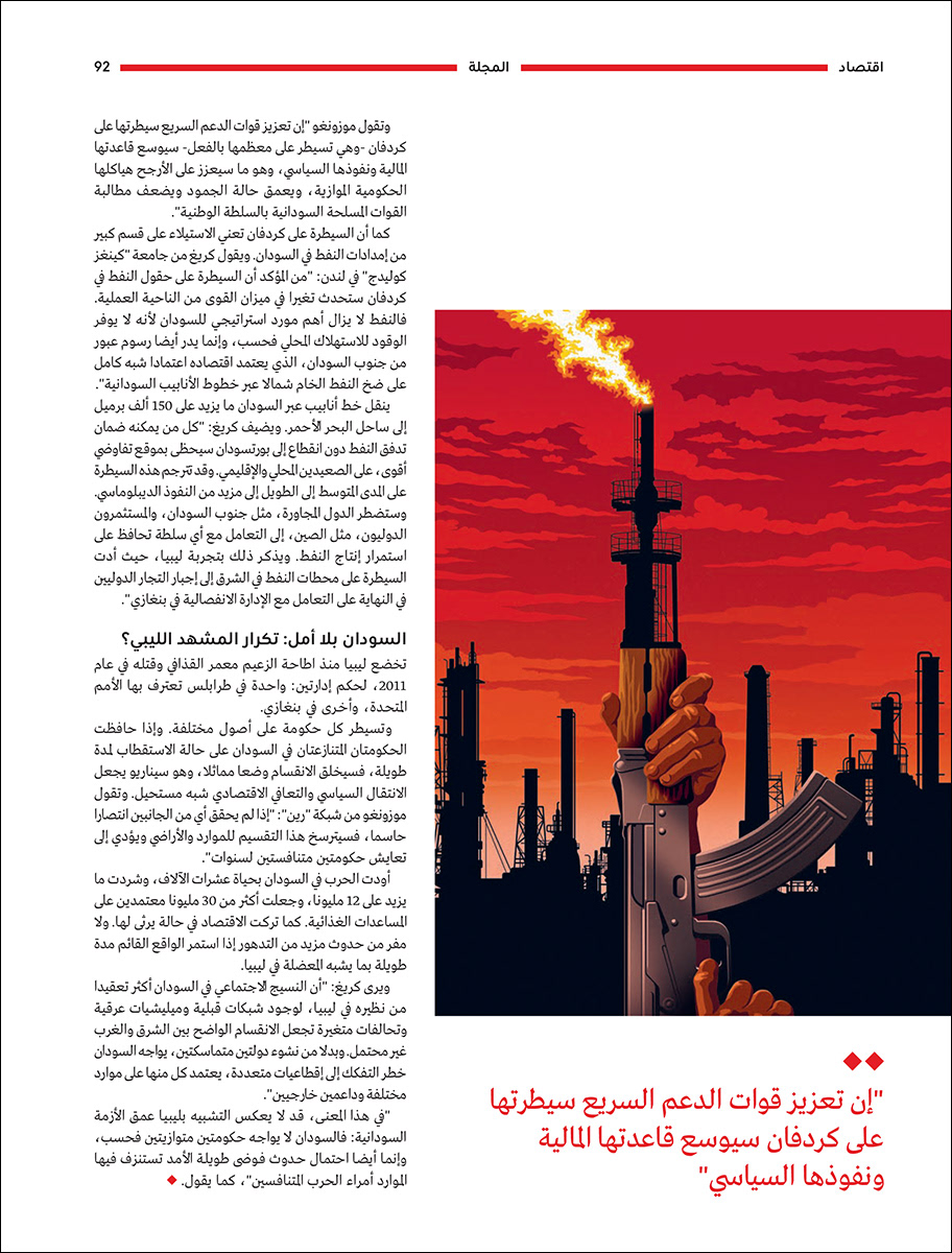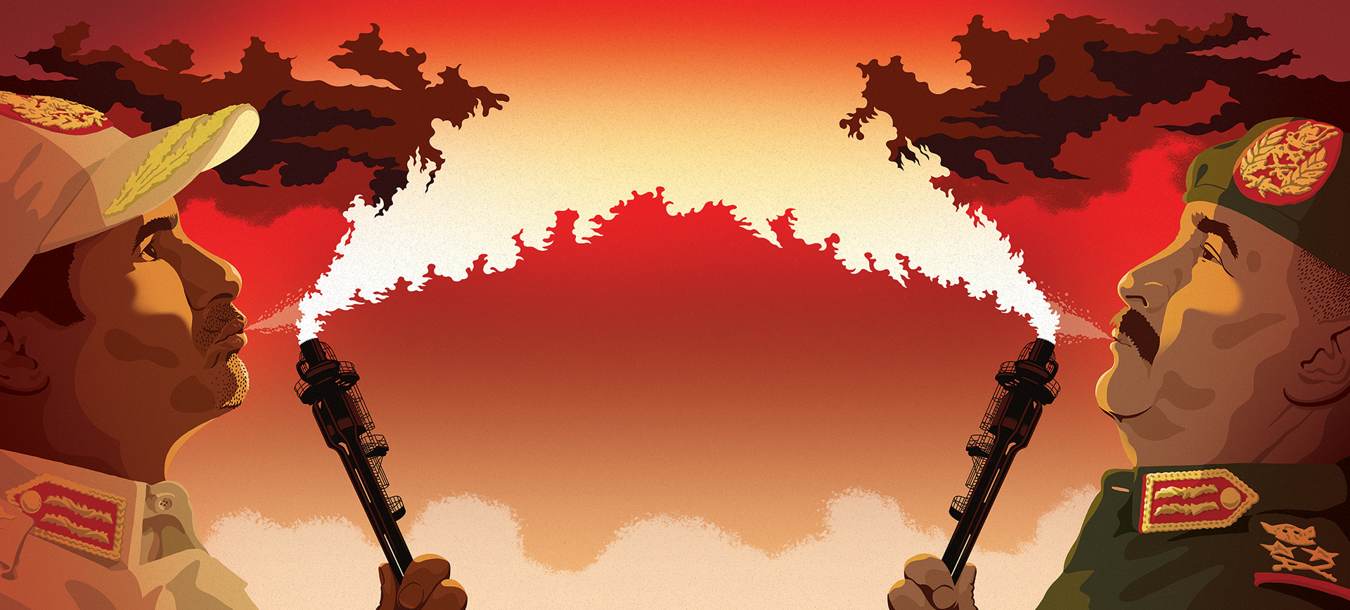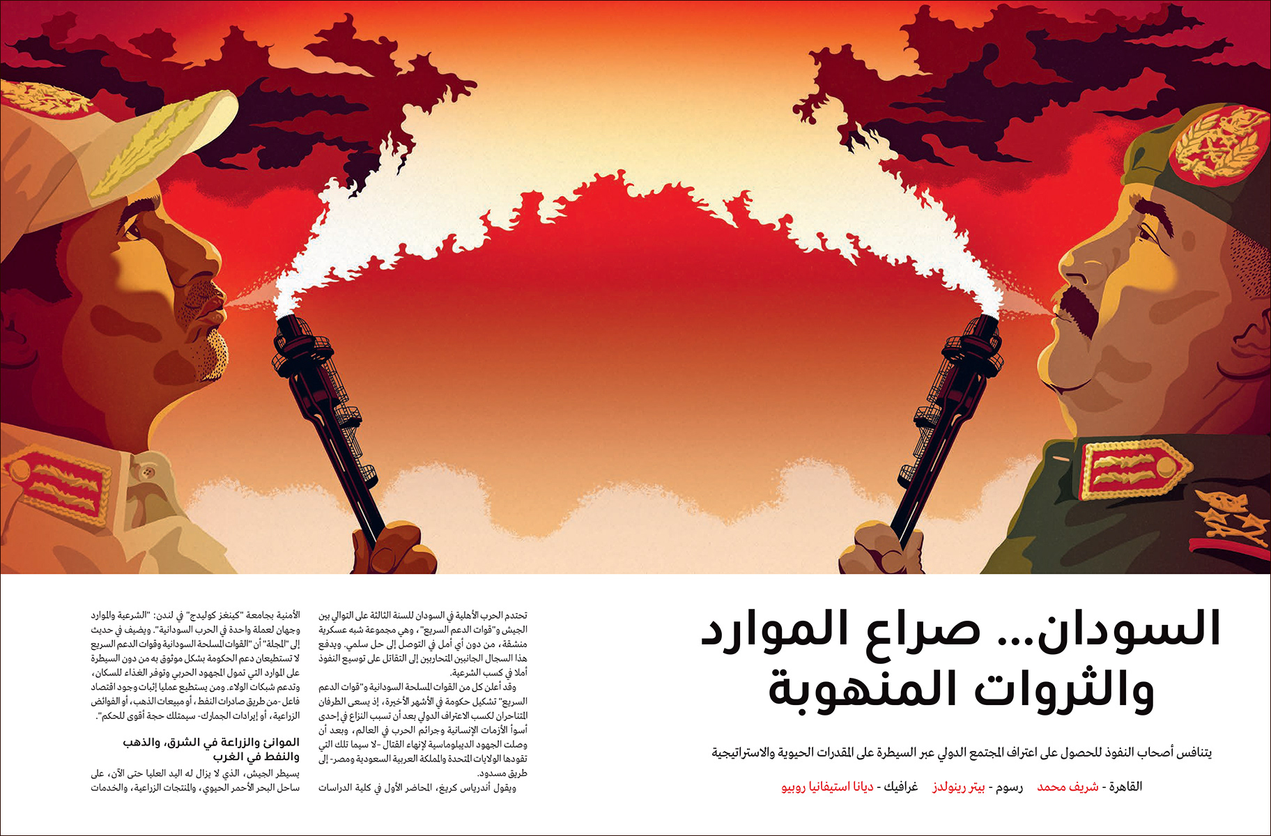 Illustrations for a feature about Sudan in Al Majalla. It concerns the struggle between the two rival warlords and the all important quest to seize control of the country's resources with the oil fields being the key battleground.