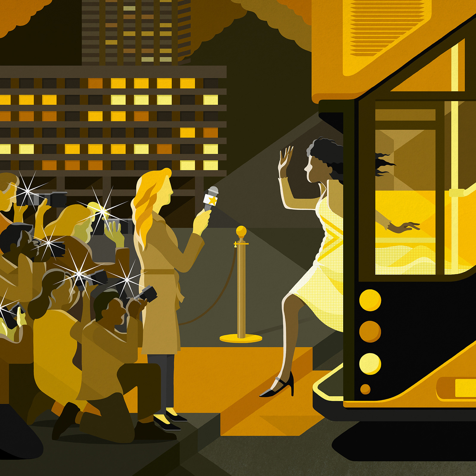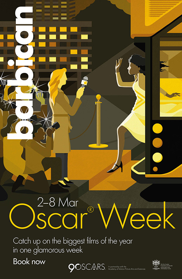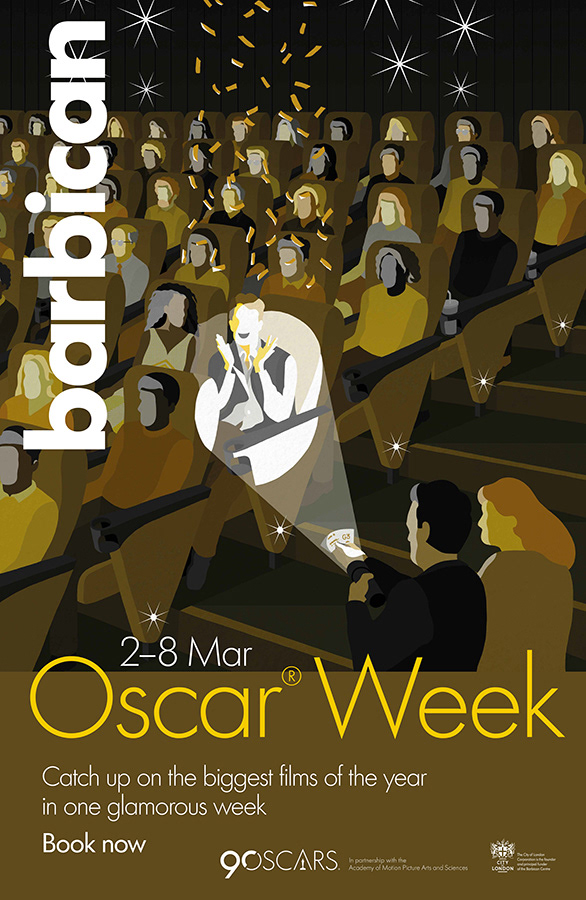 Campaign illustrations for posters and other materials in support of the Barbican Oscar Week film season. The brief was to combine the tropes of the Oscar ceremony with the tropes of attending the Barbican cinemas.