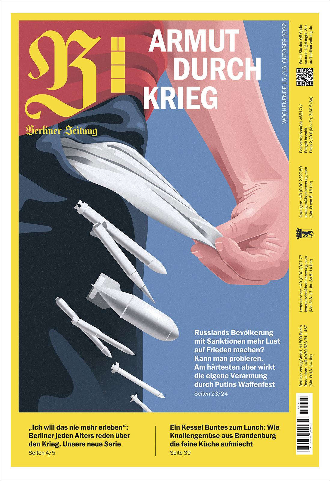 Cover illustration for Berliner Zeitung. “POVERTY THROUGH WAR”: Use sanctions to make Russia's population desire peace? One could try that. However: the hardest hit comes from the country's own impoverishment through Putin's weaponization.