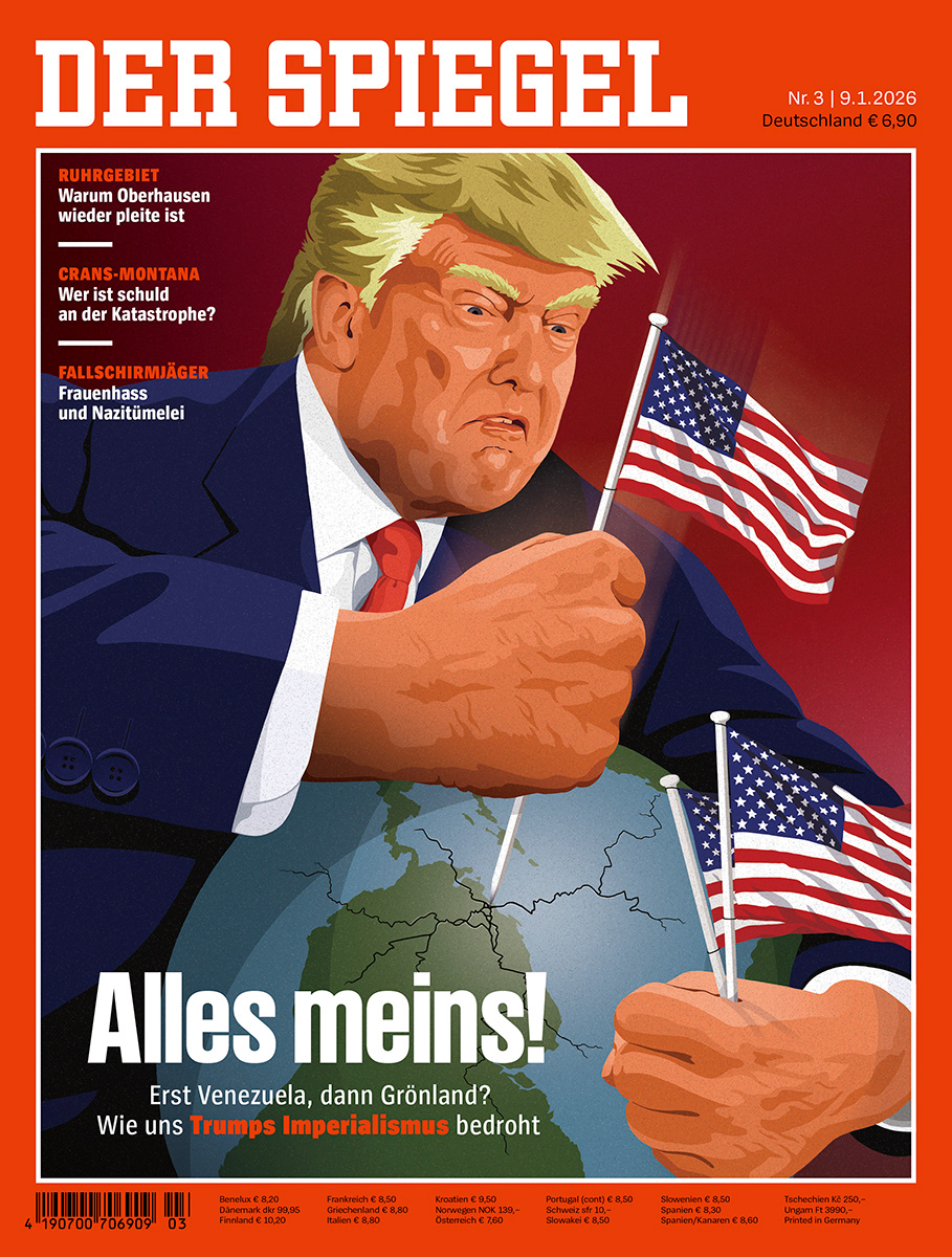 A cover illustration for Der Spiegel magazine "All Mine! First Venezuela, then Greenland?" on Trump's apparent hunger for imperialism.