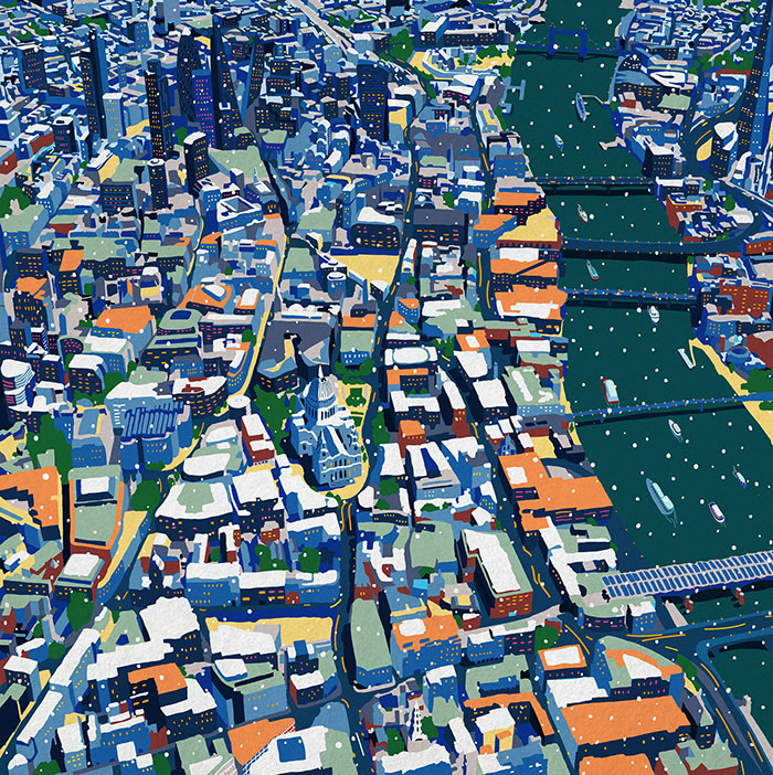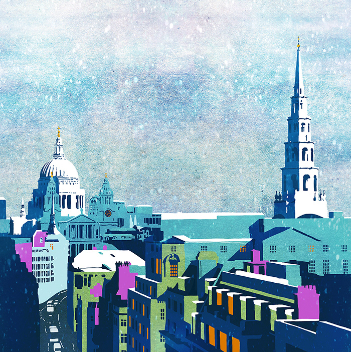 Illustrations for Christmas cards, commissioned by Hike Design for a firm of lawyers in the City of London. Each year I'm tasked with illustrating London with a view which must always include St Paul's and St Brides.