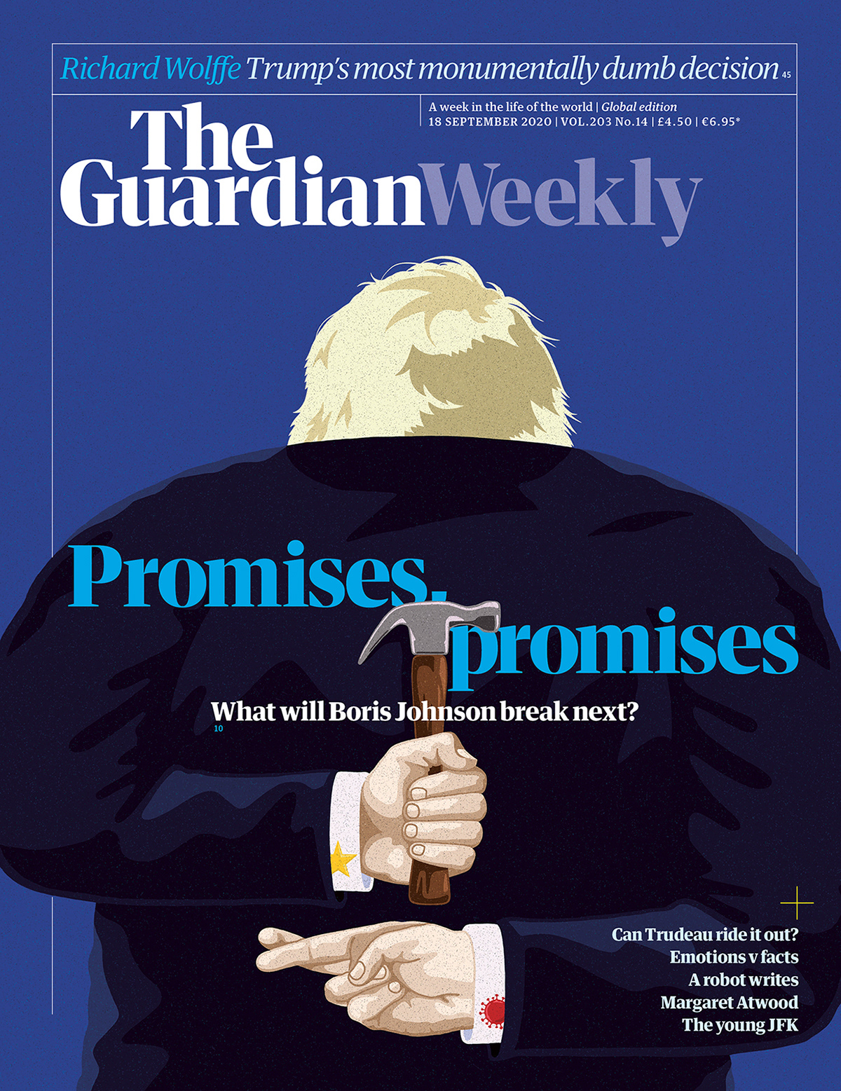 Cover illustration for The Guardian Weekly magazine looking at the behaviour of the UK Prime Minister, Boris Johnson, in his dealing with the EU and Covid-19.