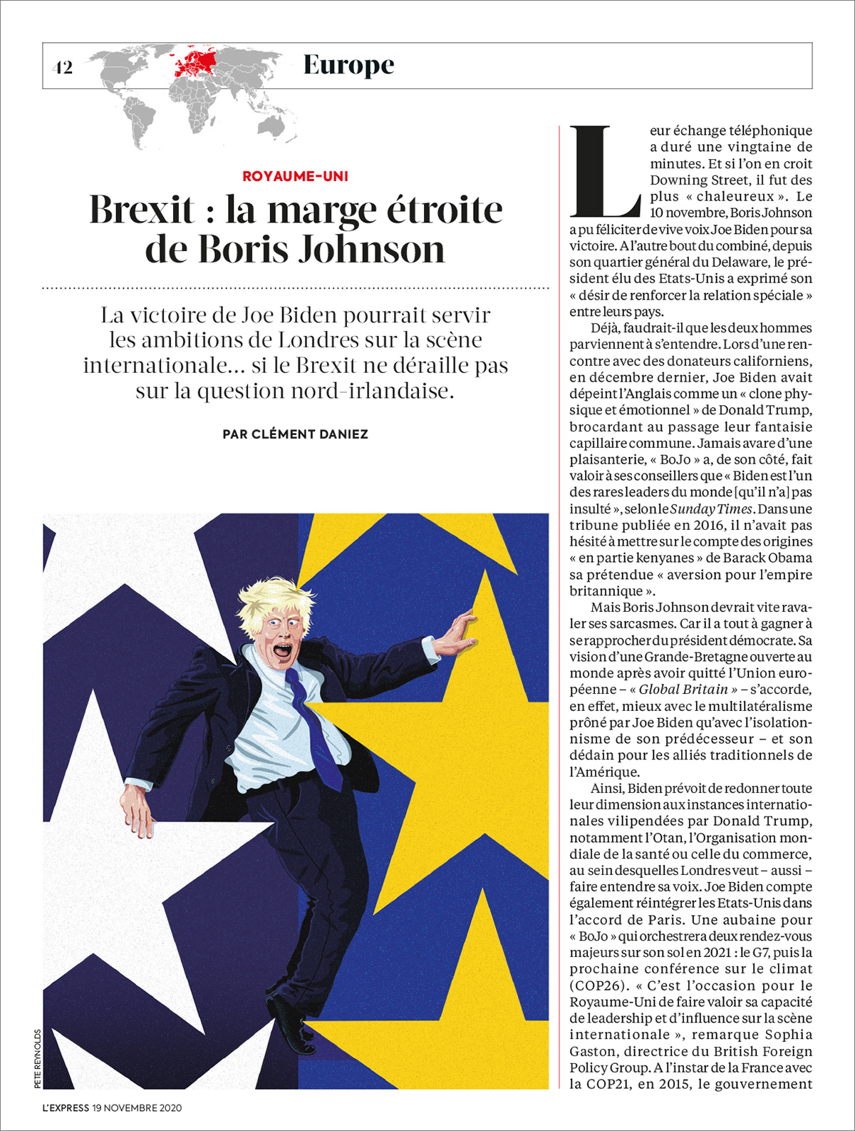 Illustration for L'Express – 'Brexit: Boris Johnson's narrow margin. Joe Biden's victory could serve London's ambitions on the international stage ... if Brexit does not derail on the Northern Irish question.'