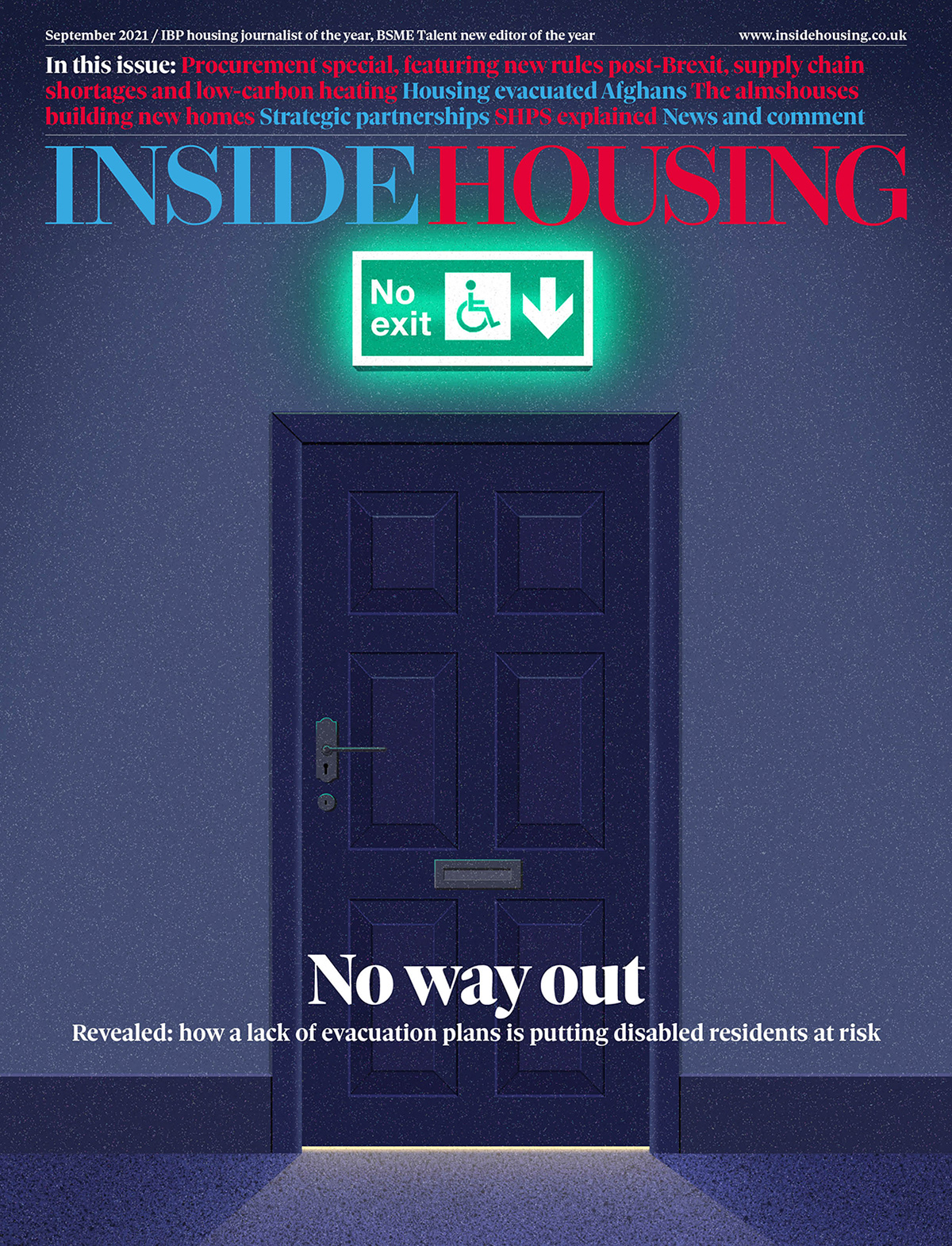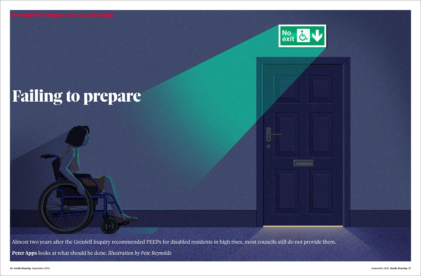 Cover and inside spread illustrations for Inside Housing magazine. 'No Way Out. Revealed: how a lack of evacuation plans is putting disabled residents at risk.'