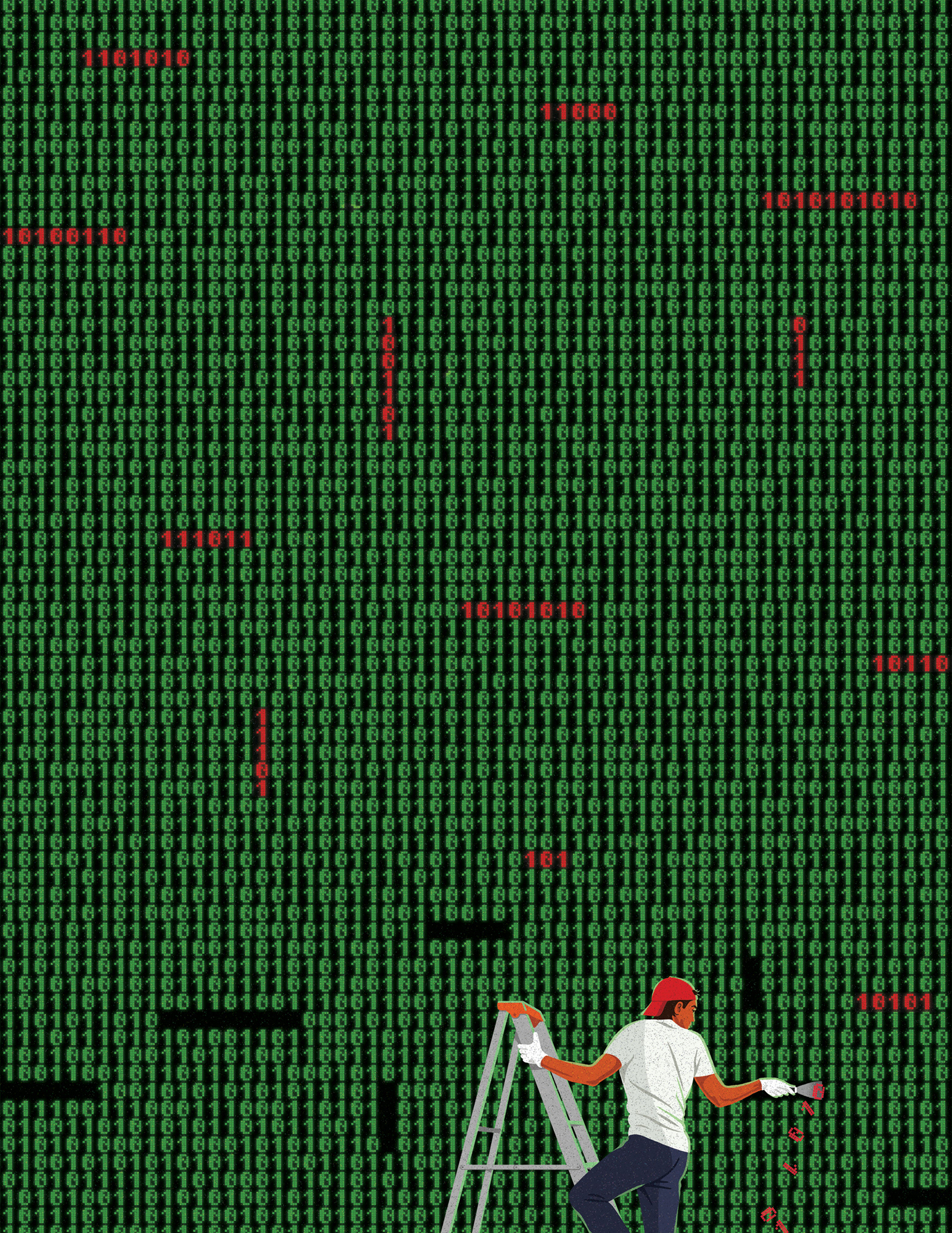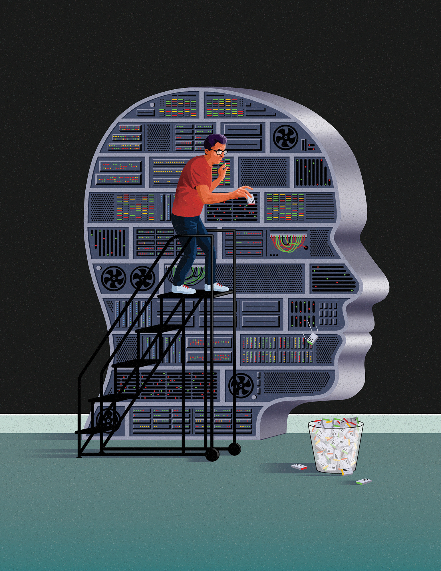 Two illustrations for New Scientist magazine. "With privacy concerns rising, can we teach AI chatbots to forget? The way AI systems work means that we can’t easily delete what they have learned."