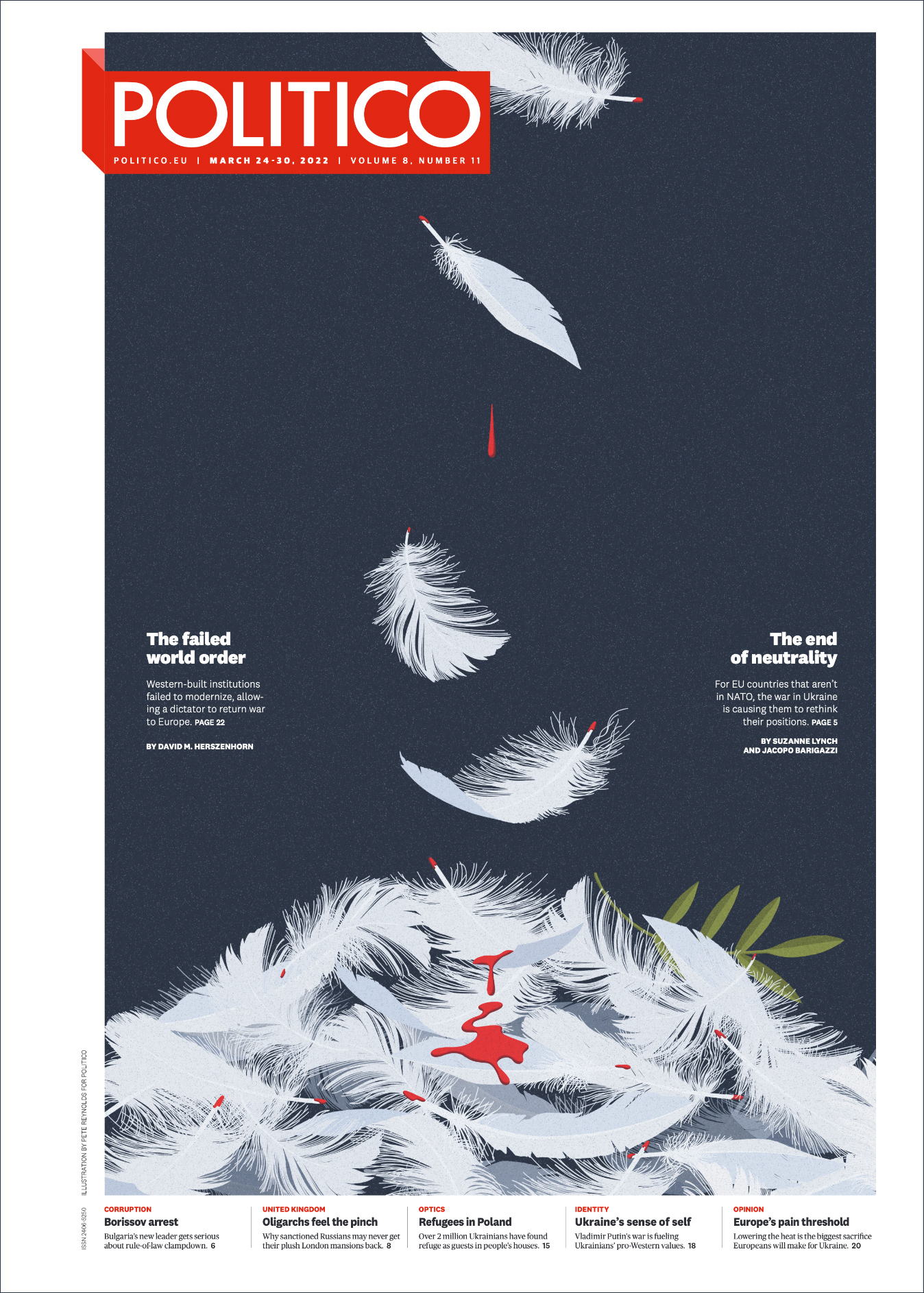 Cover illustration for Politico Europe. 'The Failed World Order. Western-built institutions failed to modernise, allowing a dictator to return war to Europe.'