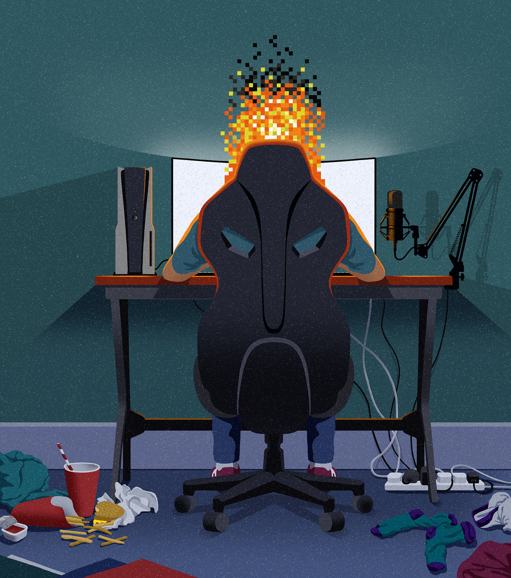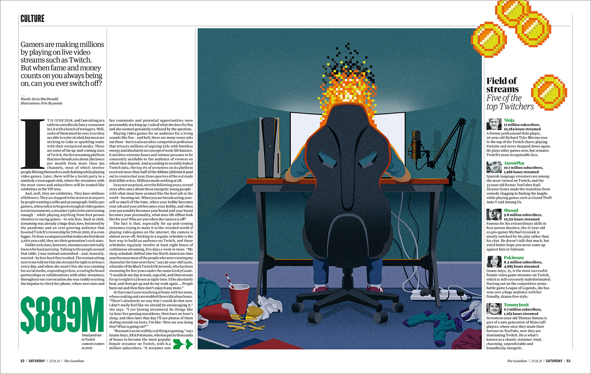 Interior and cover illustrations in The Guardian Saturday magazine, for the article 'Play, Eat, Sleep, Repeat' about the high pressure world of gaming and streaming.