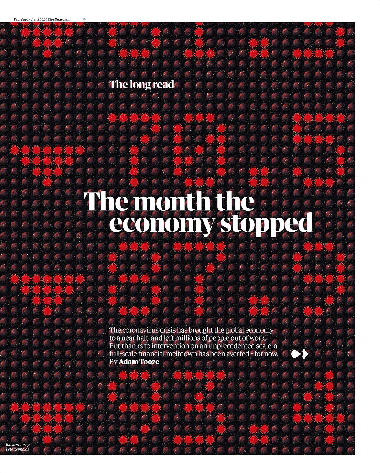 Cover illustration for The Guardian newspaper, April 2020, for 'The Long Read' article looking at how the coronavirus has infested the global financial markets.