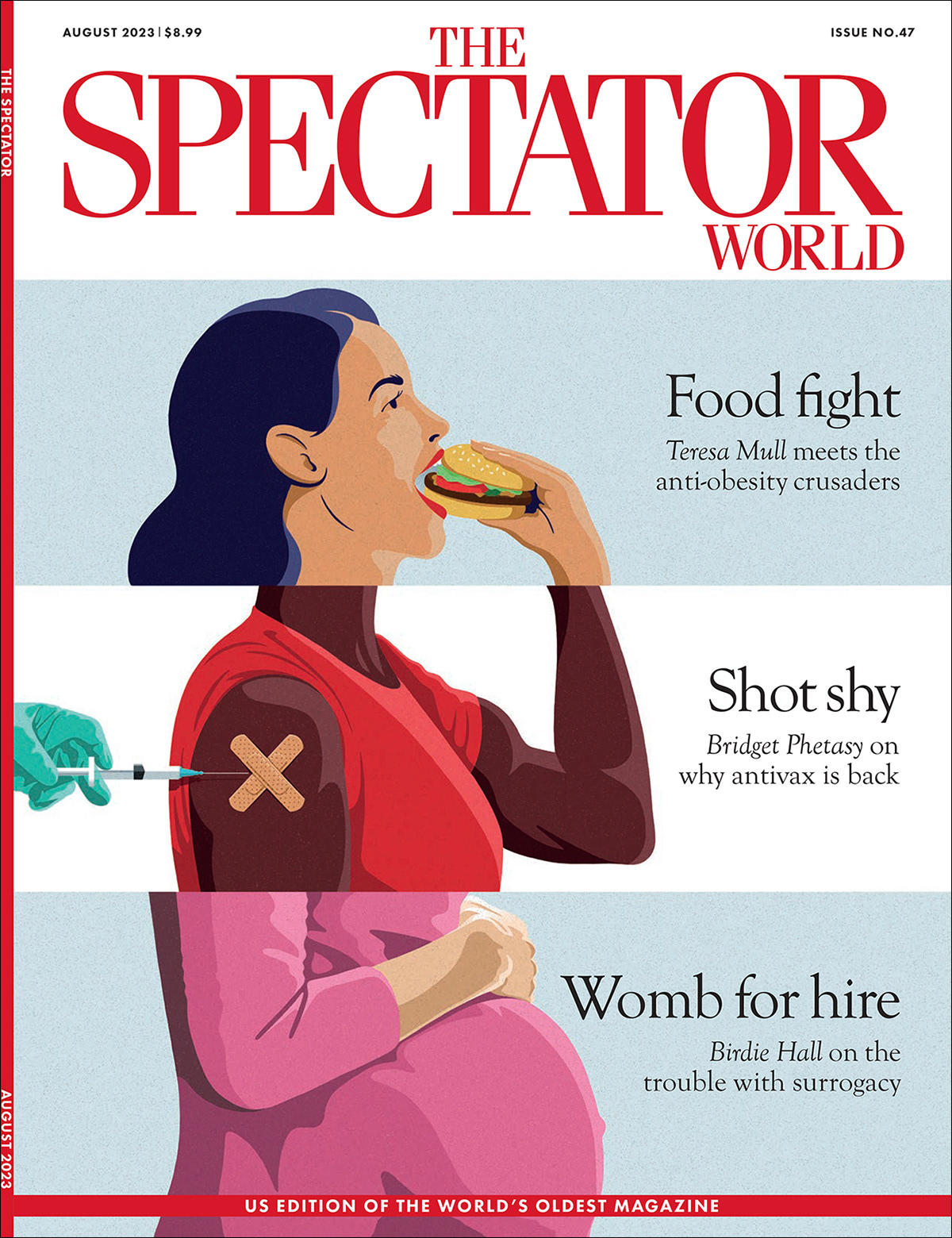 A cover illustration for The Spectator World magazine which looks at obesity, anti-vaxxers and surrogacy. "Food Fight, Shot Shy and Womb for Hire".