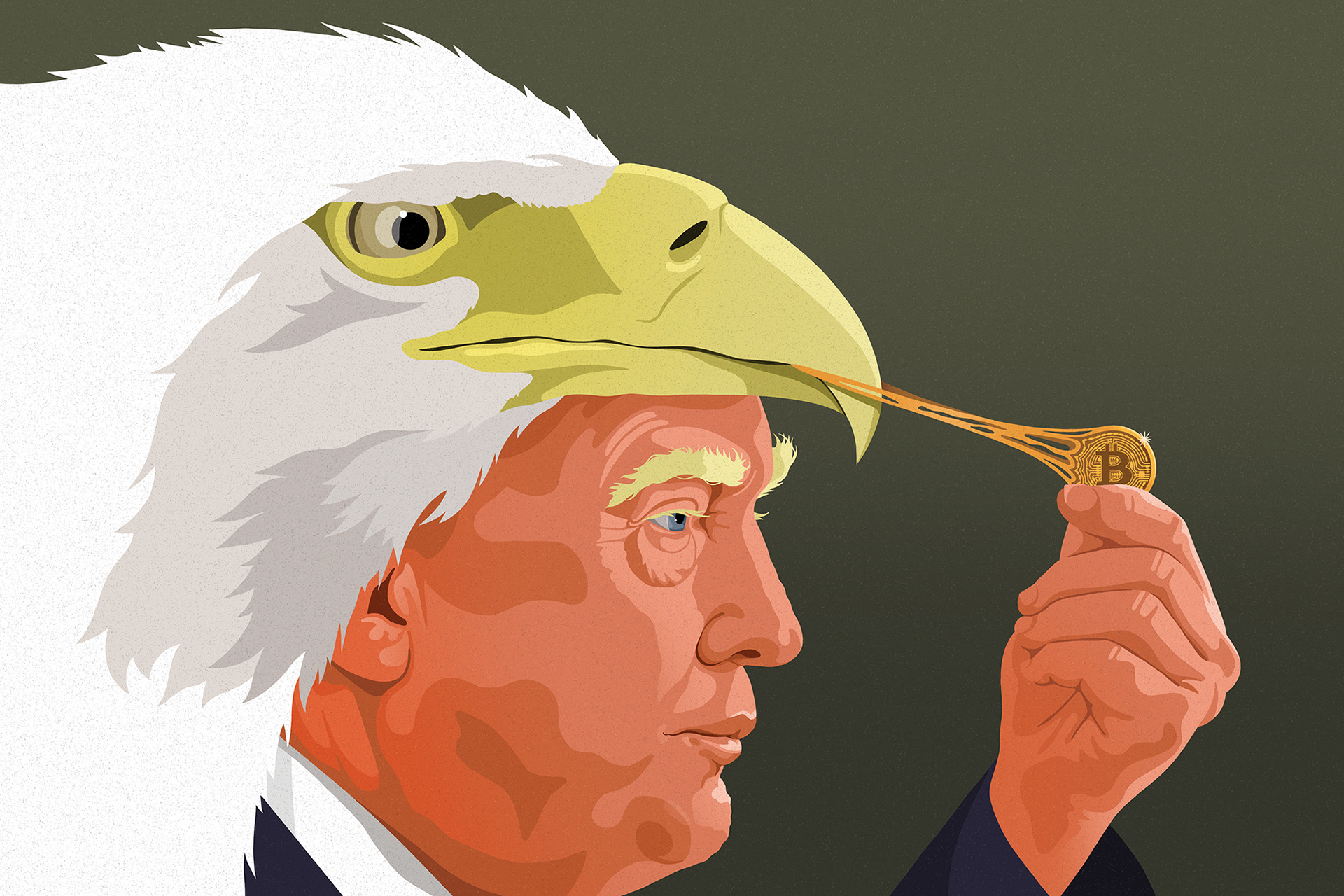 Illustration for Berliner Zeitung on how Trump and his billionaire cronies are hungrily embracing Bitcoin.