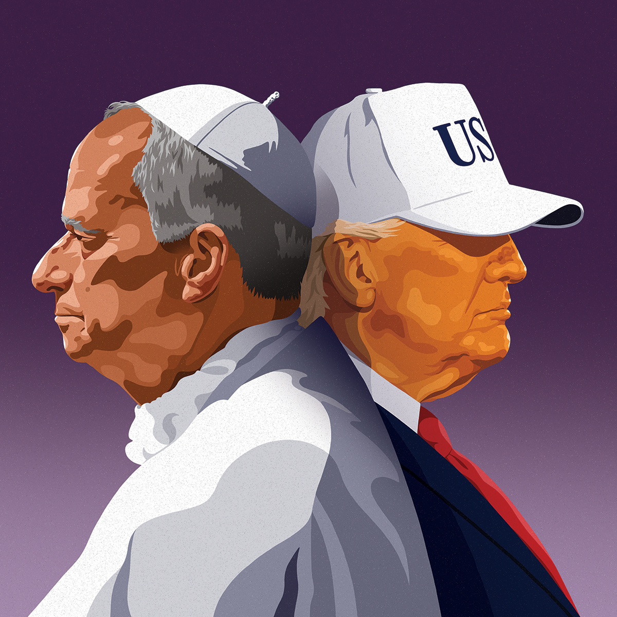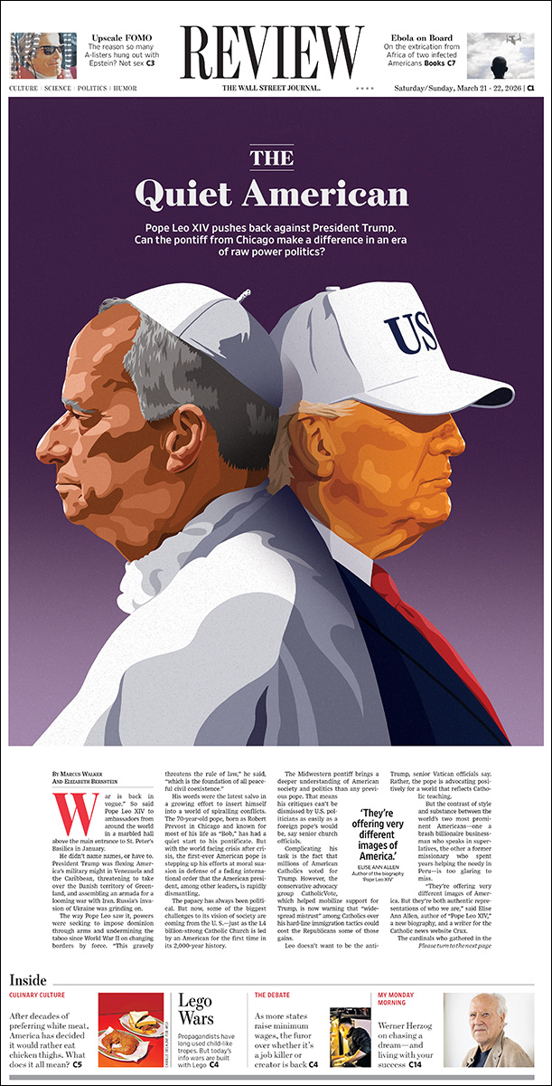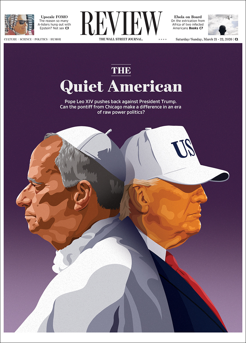 A cover illustration for the Wall Street Journal Review. "The Quiet American: How Pope Leo Is Pushing Back Against Trump. Can the low-key pontiff from Chicago make a difference in an era of raw power politics?"